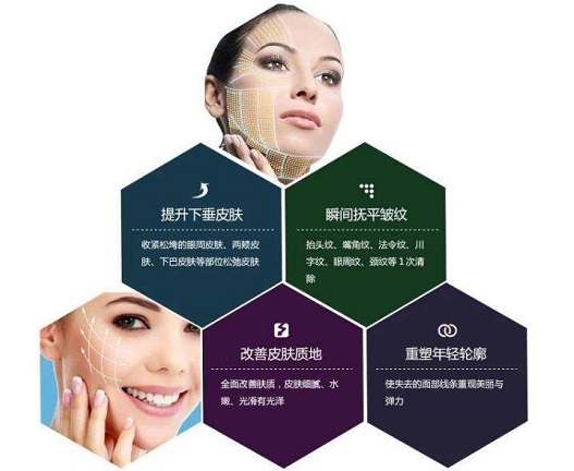 可以改善眼袋,减淡皱纹如鱼尾纹、虎纹、颈纹等,提拉面颊线条,使得总体皮肤素质得到提升。成效自然渐进,紧致持续两年甚至三年不等,效果因人而异。由于非手术,大大降低了恐惧感,不会造成任何伤害。